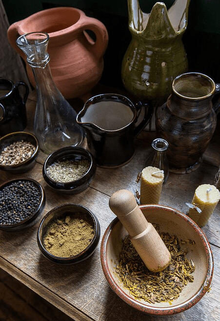 ᢁ᠋ A variety of bottles containing potions, amalgams, and the like