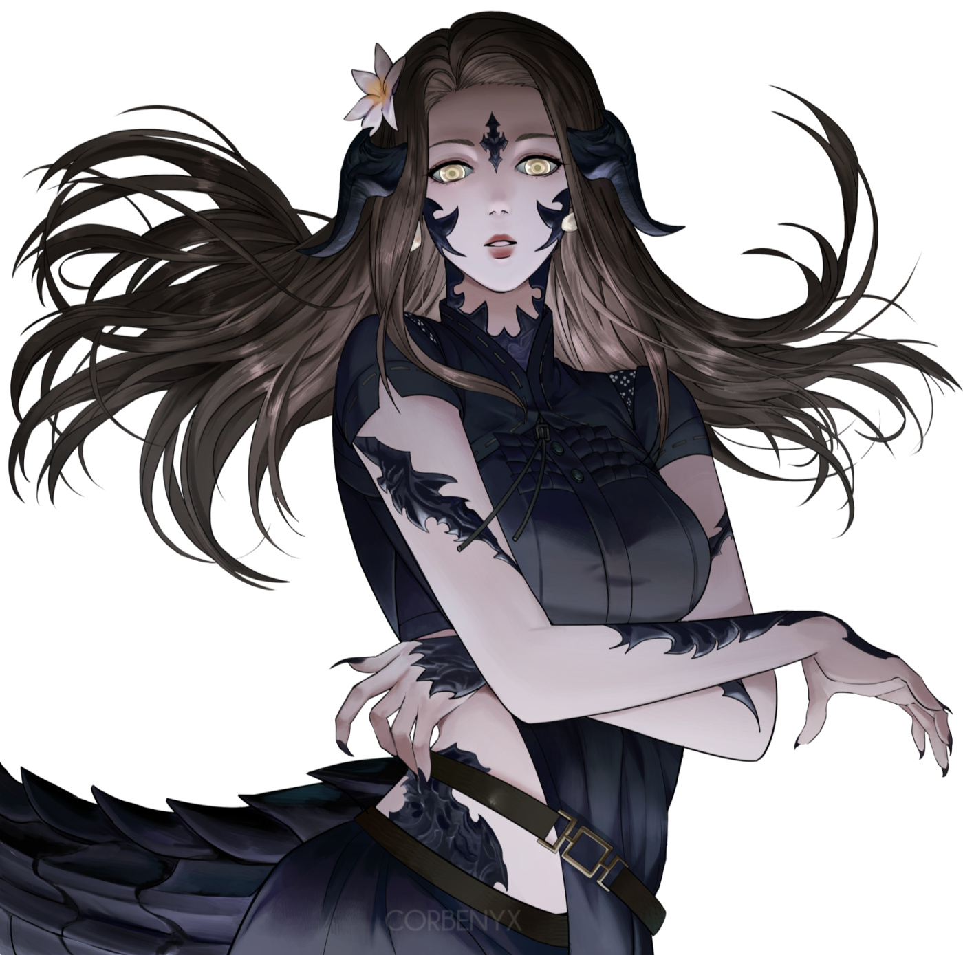 𝐄𝐘𝐄𝐒… The most notable feature of the Setgel is their eyes: the soft gold of their irises and the silver luminescence of their limbal rings. In the darkness—either in the night of the Steppe or the deep waters of the One River—their eyes are reminiscent of stars.𝐒𝐊𝐈𝐍… With pale, ashy skintones that vary slightly from member to member, those of the Setgel are able to obscure themselves within the waters of the One River, blending in with the stones of the riverbed below.𝐇𝐀𝐈𝐑… The hair colors of the Setgel range from a dusky brown to a deep gray-brown while the texture retains straight, silken strands.𝐒𝐂𝐀𝐋𝐄𝐒… Dark as the night, with subtle violet undertones—their scales are a source of pride. They are diligently cared for to preserve their luster.𝐇𝐎𝐑𝐍𝐒 & 𝐓𝐀𝐈𝐋𝐒… The horns of a Setgel tribe member are usually thin and tapered, and their tails often complement them in appearance.𝐓𝐄𝐄𝐓𝐇 & 𝐂𝐋𝐀𝐖𝐒… Both their teeth and their claws are markedly sharp, and they are maintained to be so in order to disable prey in the absence of tools.𝐋𝐔𝐍𝐆𝐒… As relatives of the Ejinn tribe, the Setgel have increased lung capacity in order to store and compress large amounts of oxygen. With this, they are able to be submerged within water for an extended period of time.